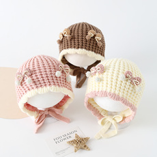 女宝宝帽子秋冬款蕾丝花边针织护耳帽洋气女童保暖毛线系带宫廷帽