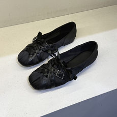 2026年新款黑色缎面芭蕾舞鞋女蝴蝶结铆钉圆头玛丽珍鞋女平底单鞋