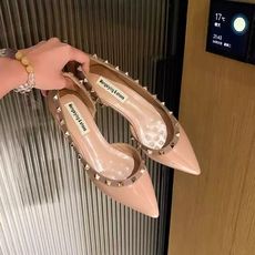 低跟铆钉单鞋女粗跟尖头裸色柳丁平底鞋2025春秋新款漆皮包头凉鞋