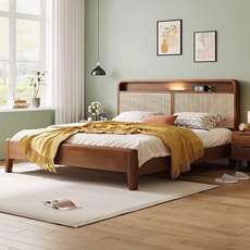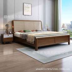 北欧藤编实木床1米5橡胶木家具民宿风单人床主卧1.8米双人床