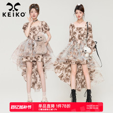 妖精的口袋兔子印花灰色网纱拼接连衣裙女2026夏季新款度假风裙子