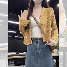 法式镂空黄色小个子穿搭小香风短款毛衣外套开衫女春秋款针织上衣