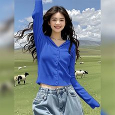 克莱因蓝连帽针织开衫女春秋穿搭修身显瘦长袖短款chic上衣欧若风