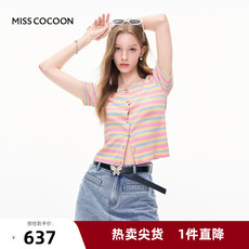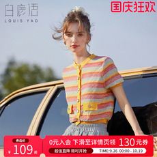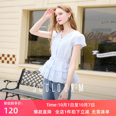 三彩2025夏季新款条纹小衫V领木耳边抽绳上衣开衫清新M