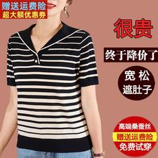 大牌桑蚕丝短袖t恤女2025夏季海军领条纹渐变中年妈妈时尚上衣薄