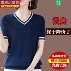 2024夏季薄款桑蚕丝短袖t恤女v领宽松冰丝针织衫真丝短款妈妈上衣