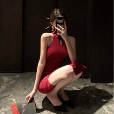 网红直播复古国潮年轻款挂脖性感开叉收腰显瘦包臀改良旗袍连衣裙
