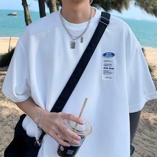 夏季贴标华夫格纯色短袖t恤男女潮流宽松半袖情侣装oversize上衣