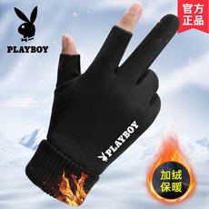 花花公子麂皮绒手套男秋冬季户外骑行加绒保暖防风半指露二指手套