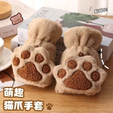 熊掌猫爪手套女冬季加绒加厚保暖可爱学生半指写字防寒防冻露指潮