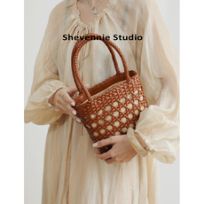 Shevennie度假菜篮子牛皮手工编织包手提斜挎单肩女真皮水桶包