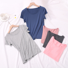圆领带胸垫短袖t恤女夏文胸一体可外穿纯色修身打底上衣莱赛尔棉
