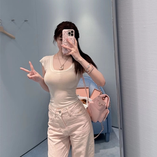 NEVA HU 白色方领短袖t恤女2025夏季新款修身显瘦打底衫正肩上衣