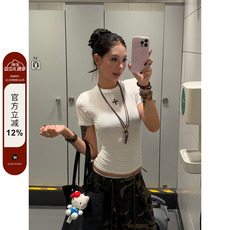 F383 美式复古十字印花正肩短袖T恤收腰修身内搭打底衫辣妹上衣女