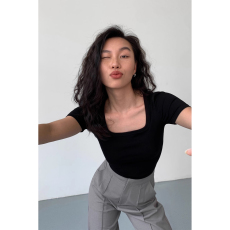 正肩方领短袖t恤打底衫女生白色夏新款短款修身显瘦上衣纯色棉