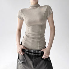 半高领小飞袖针织短袖T恤女夏季短款内搭正肩修身打底气质上衣