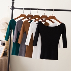 黑色一字领中袖上衣高级感露肩针织衫七分袖打底衫女内搭秋季毛衣