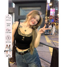 shemoda蕾丝拼接个性印花吊带背心女 设计感低领单排扣辣妹短上衣