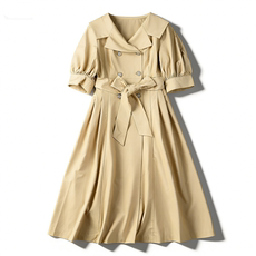 通勤甜美娃娃领红色单排扣夏季修身A字大摆短袖连衣裙礼服裙DRESS