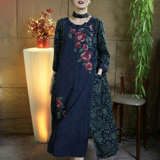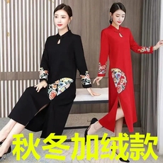 复古印花改良旗袍连衣裙妈妈装春秋季新款宽松显瘦中长款长袖裙子