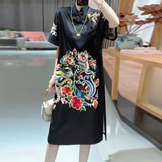 【羊在在】民族风刺绣连衣裙中长款夏季中国风宽松改良旗袍裙L019