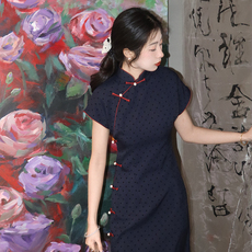 半盏星藏蓝色古法旗袍新中式改良2025新款夏季波点民国宽松日常女