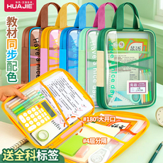 华杰180度大开口文件袋小学生手提袋拎书袋4层大容量补习袋透明科目分类袋初中生专用作业收纳袋拉链式手提袋