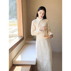 秋冬新款国风复古女装禅意茶艺服女水貂毛羊毛改良旗袍中式连衣裙