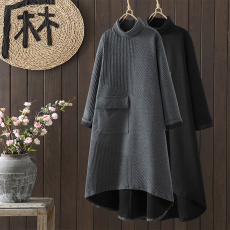 梭家|人生缓缓|文艺复古条纹纹理亚麻棉加绒连衣裙秋冬直筒裙