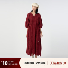 【商场同款】AUM噢姆春秋新款刺绣提花系带领长款文艺感连衣裙女