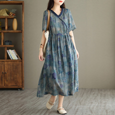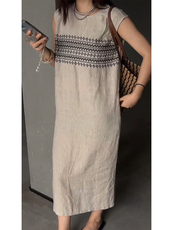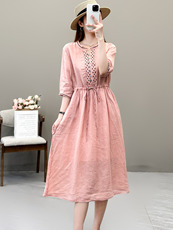 复古文艺刺绣花色苎麻连衣裙女夏季新款中袖中长款裙子显瘦度假裙