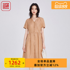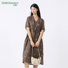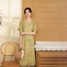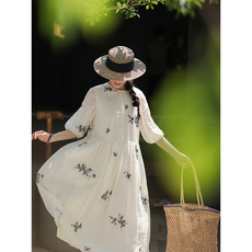 布景短袖连衣裙女2025年夏季新品文艺绣花半开领苎麻中长裙子6515