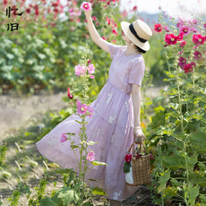 【花开的声音】文艺刺绣连衣裙女夏薄款短袖裙温柔紫色收腰A字裙
