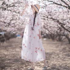 D【5折】春夏新款文艺花边圆领刺绣碎花连衣裙宽松荷叶袖长裙子女