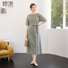 布景连衣裙女夏季文艺中国风刺绣圆领可收腰苎麻过膝中长裙子1016