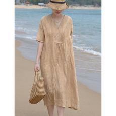 布景连衣裙女春夏文艺半开V领刺绣前短后长宽松长袖苎麻裙子0151