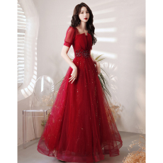 时尚流苏短袖酒红色鱼尾长款晚礼服 新娘敬酒服 回门 结婚 订婚