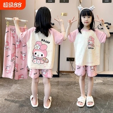 【亲子】柒号童仓甜美卡通家居套装春夏装新款女大童格子睡衣睡裤