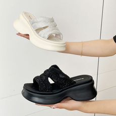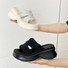 厚底松糕坡跟凉鞋女2025夏新款仙女风一字带亮片罗马凉鞋厚底单鞋
