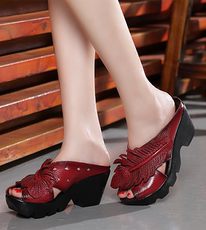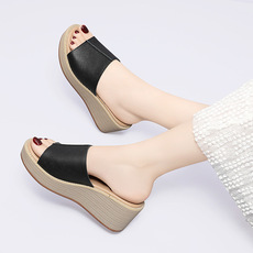 断码2025夏季新款坡跟拖鞋真皮厚底鱼嘴女鞋软底妈妈拖凉鞋牛皮鞋