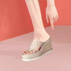 凉鞋女夏季新款水晶透明坡跟鱼嘴防滑耐磨露趾百搭休闲一脚蹬女鞋