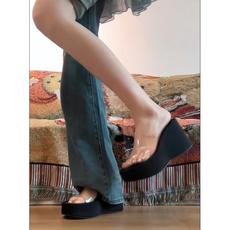 绝美坡跟凉拖鞋女外穿2025新款高级感松糕厚底一字拖高跟透明凉鞋
