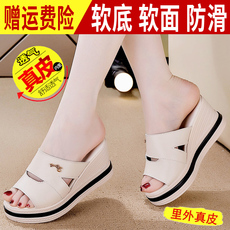 软牛皮真皮坡跟拖鞋女外穿新款中B跟一字拖妈妈百搭时尚软底凉鞋