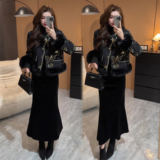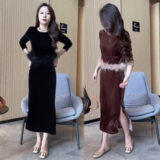 时尚名媛气质金丝绒套装女秋季新款羽毛拼接设计感包臀裙两件套潮