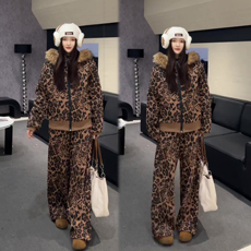 复古豹纹珊瑚绒外套阔腿裤两件套套装女欧洲站2025冬装新款欧货潮