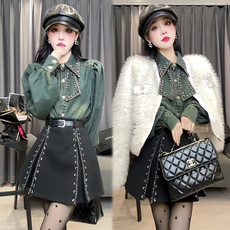 名媛风时尚套装女秋季新款立领灯笼袖衬衫+立体花朵马甲+半身裙潮