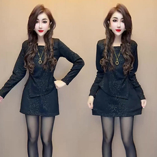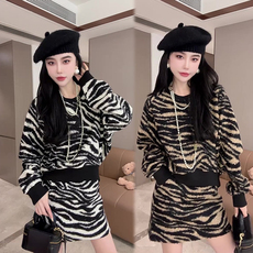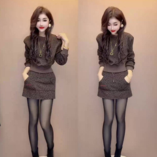 豹纹潮流加绒套装女冬季新款圆领短款上衣+高腰韩版短裙两件套装