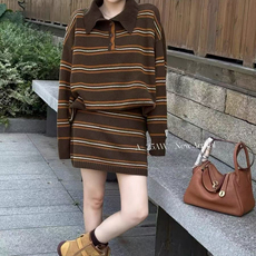 欧洲站2025秋冬新款女潮时尚休闲条纹POLO领羊毛针织衫+短裙套装