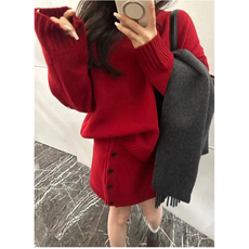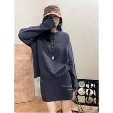 欧洲站2025秋冬新款女潮休闲百搭圆领套头羊毛毛衣+针织短裙套装