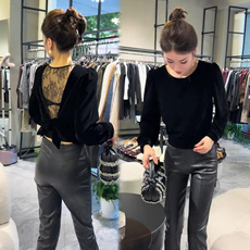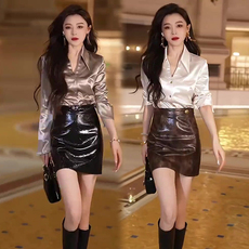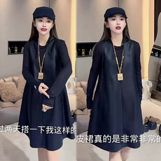 欧货2024秋季新款时尚两件套女百搭长袖打底衫PU皮背心裙潮流套装